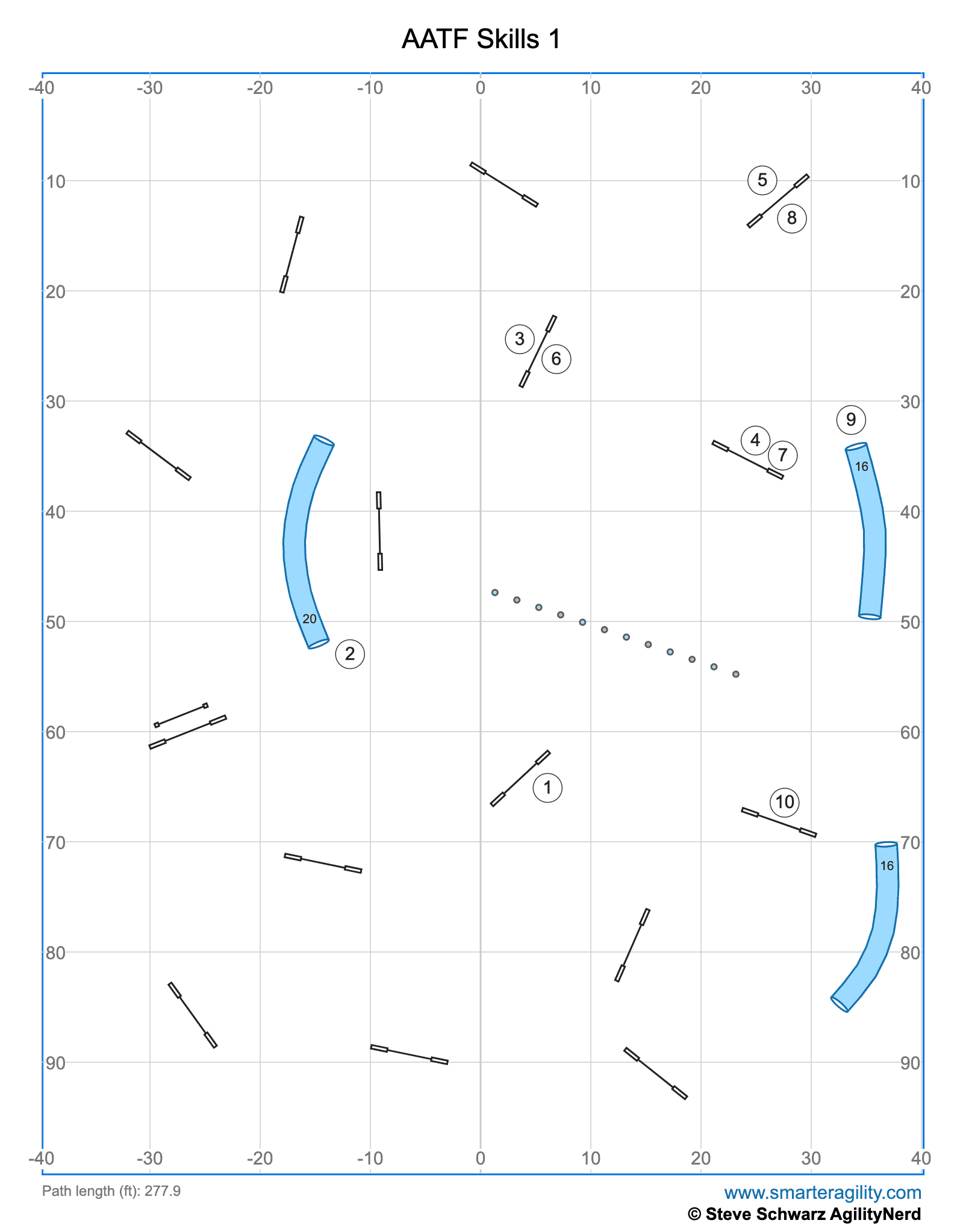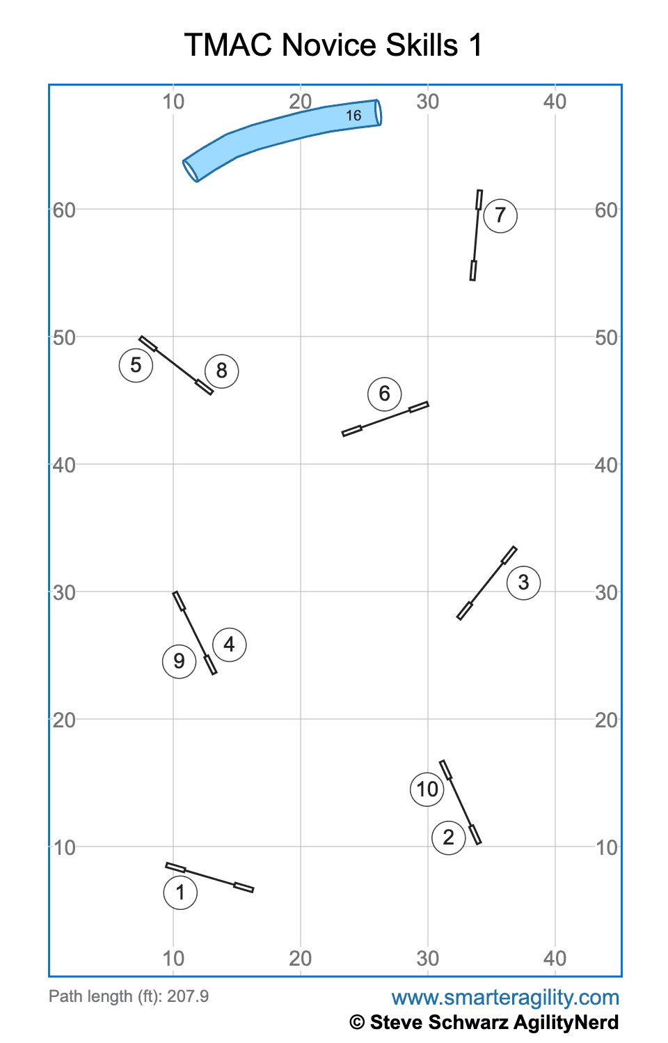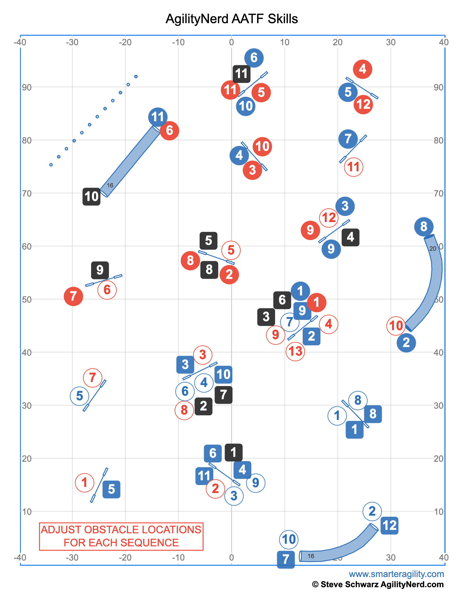 Seven short skills training sequences for the same equipment setup designed to work on fundamental and advanced handling techniques. Each sequence contains multiple skills and challenges for both handler and dog.