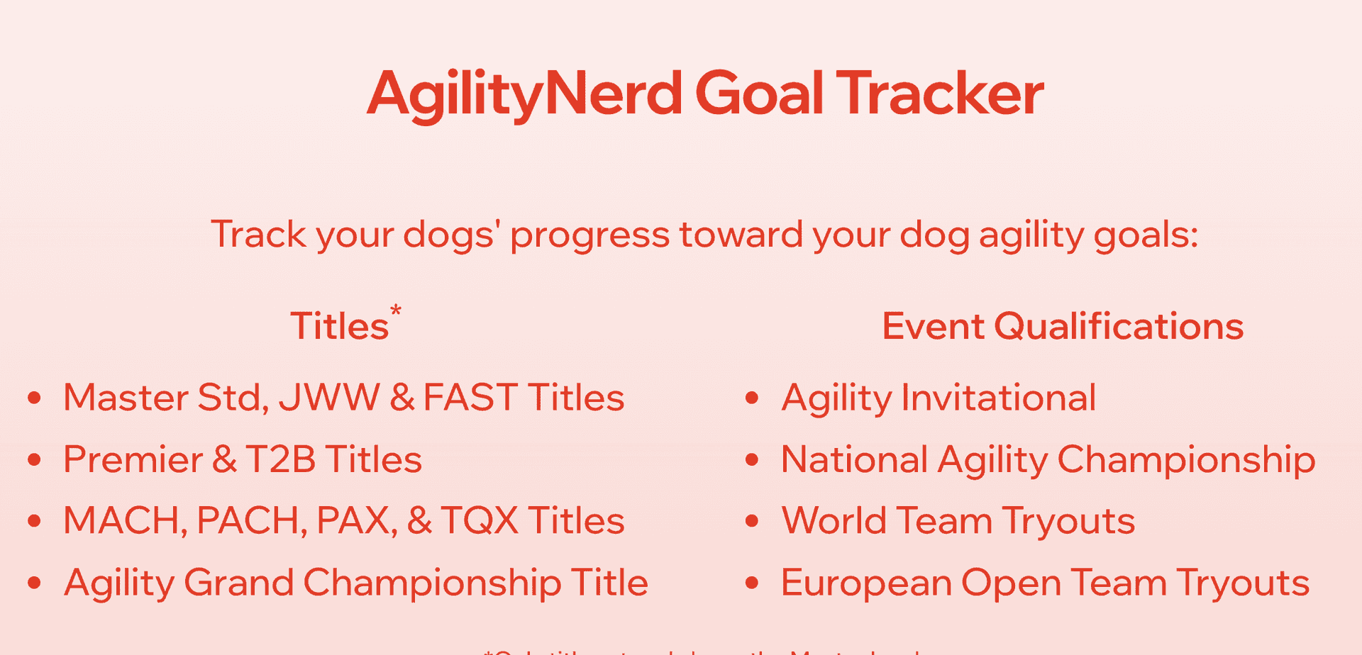 I’m excited to announce the release of AgilityNerd Goal Tracker - a donation-ware web app to help you track your dogs’ progress toward AKC agility titles and event qualifications!