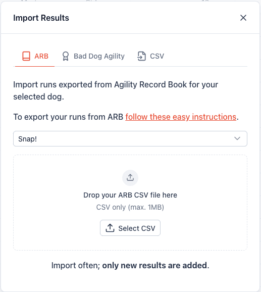 Quick Result Entry - Easily enter your dogs’ agility trial results. Import trial results from Agility Record Book, CSV files, or Bad Dog Agility Ribbon Wall. Or simply enter your current totals to get started quickly and then start entering your new trial results!